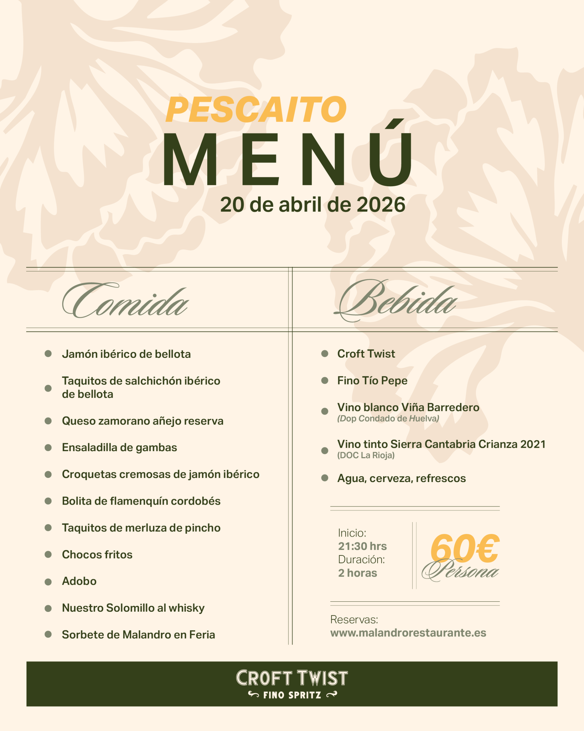 Una noche para venir con arte, elegancia y ganas de pasarlo bien. Nosotros nos encargamos del resto: La Caseta más divertida y un exclusivo Pescaíto de Feria servido con menú en mesa, para disfrutarlo sin prisas y como manda la tradición.